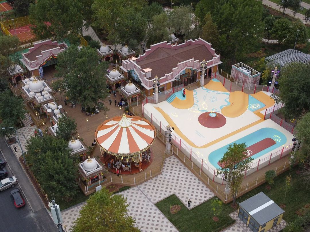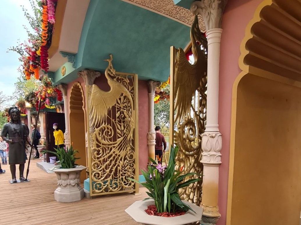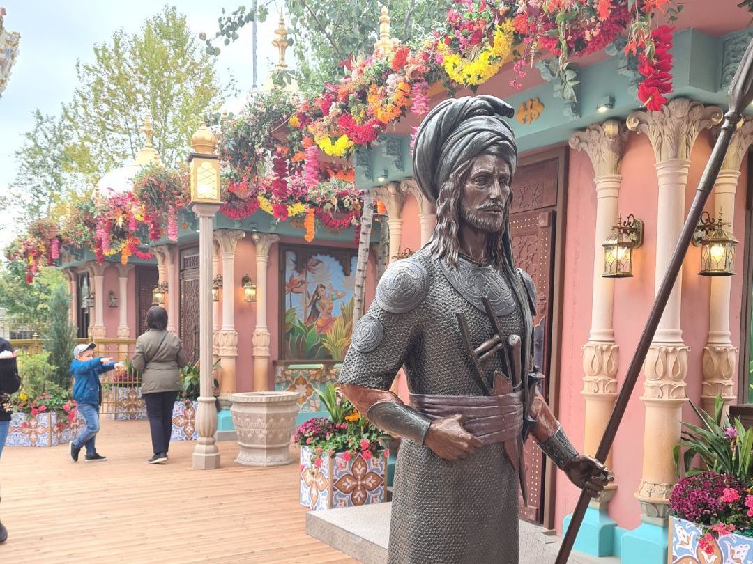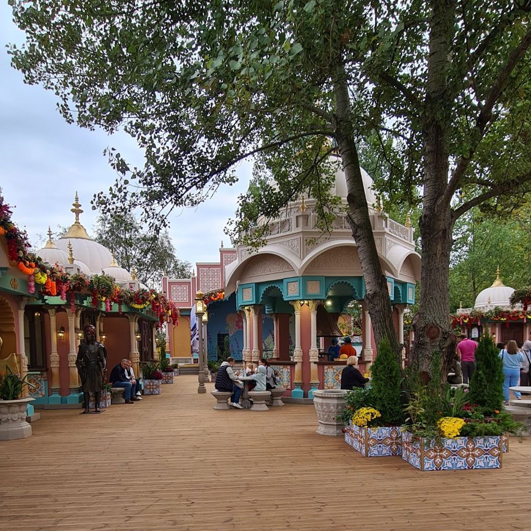 Стилистика архитектурного решения создает волшебную атмосферу востока и переносит посетителей в индийский дворец с его теплыми цветами, богатством золотого убранства и мерцанием ажурных фонариков, как в рассказе про золотую лань. Характерной особенностью индийских сооружений является многообразие сложного декора, преобладание тёплых цветовых оттенков и украшение позолоченными шпилями, фигурами, решётками, а также луковичные купола. Решение сформировано таким образом, чтобы создать атмосферу праздника и веселья, царящего на частых индийских фестивалях цвета и красок. Цветные градиенты на колоннах подчеркивают декоративность и сказочность. Малые архитектурные формы выполнены в виде резных каменных тумб с тонкой орнаментовкой.