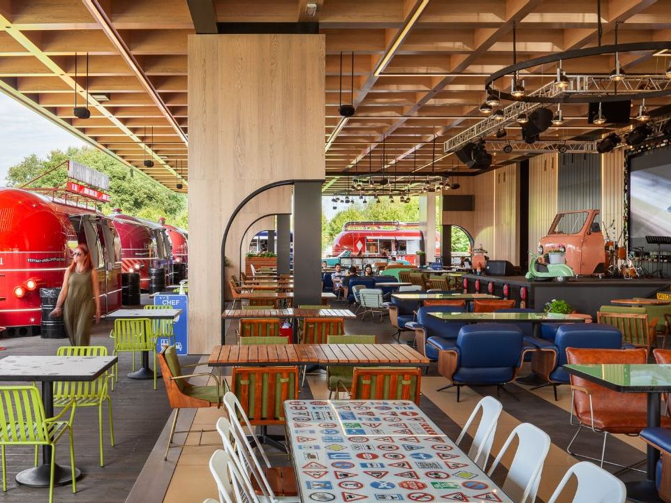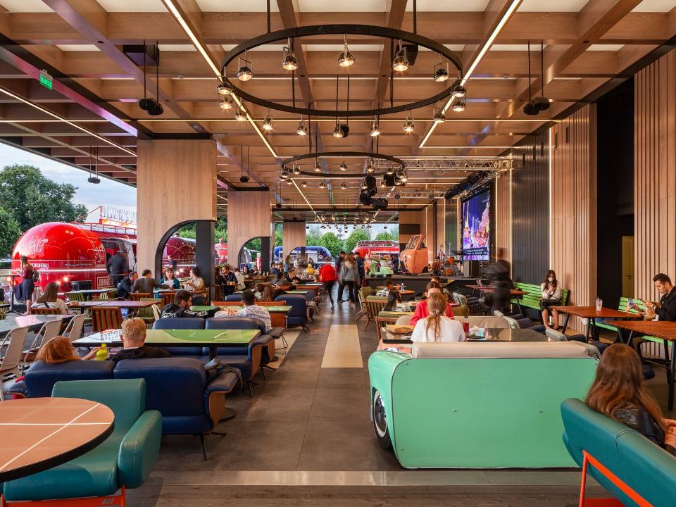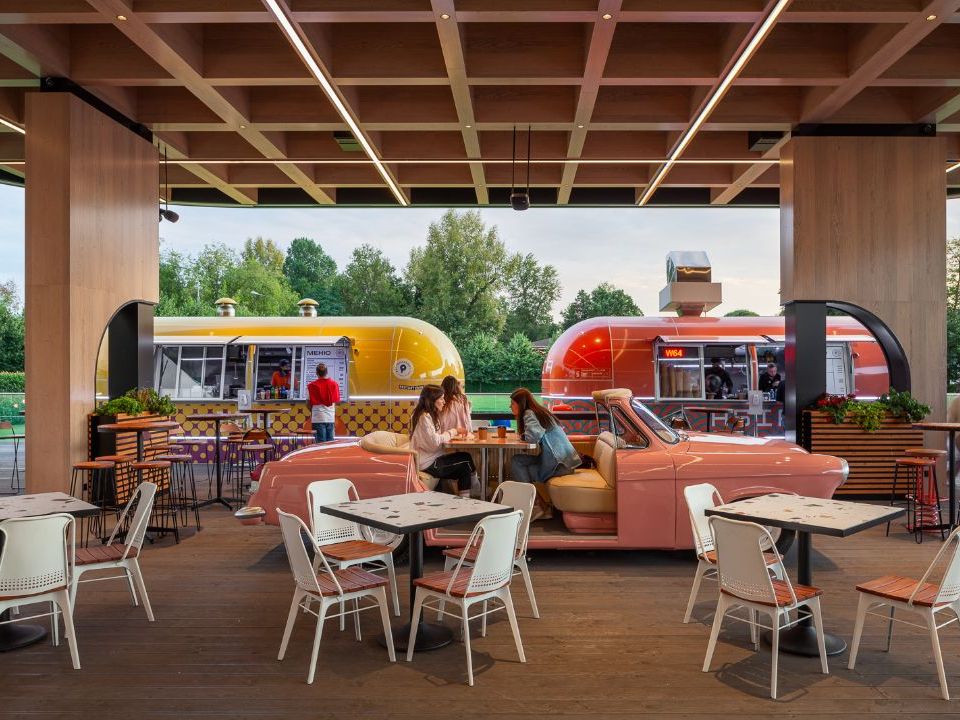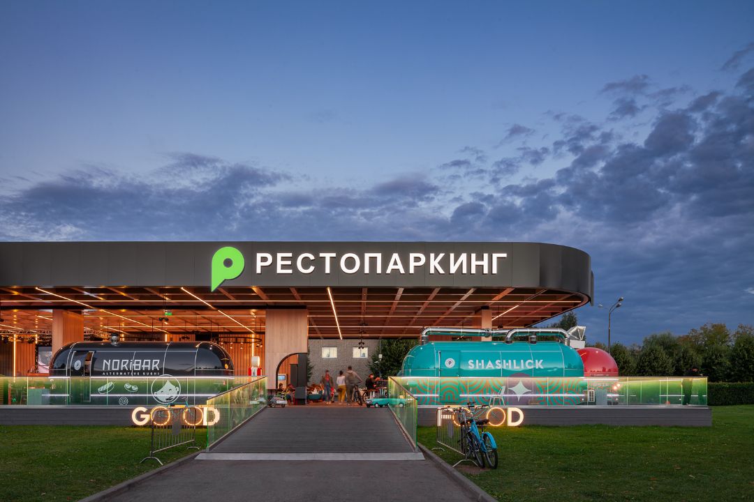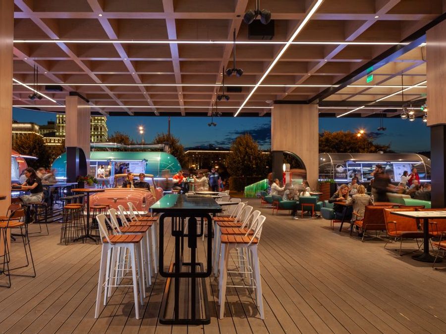 Павильон Resto представляет собой некапитальное временное сооружение, выполненное из металлического каркаса, обшитого композитными деревянными панелями. Цвет и рисунок панелей были разработаны и изготовлены специально для этого проекта.