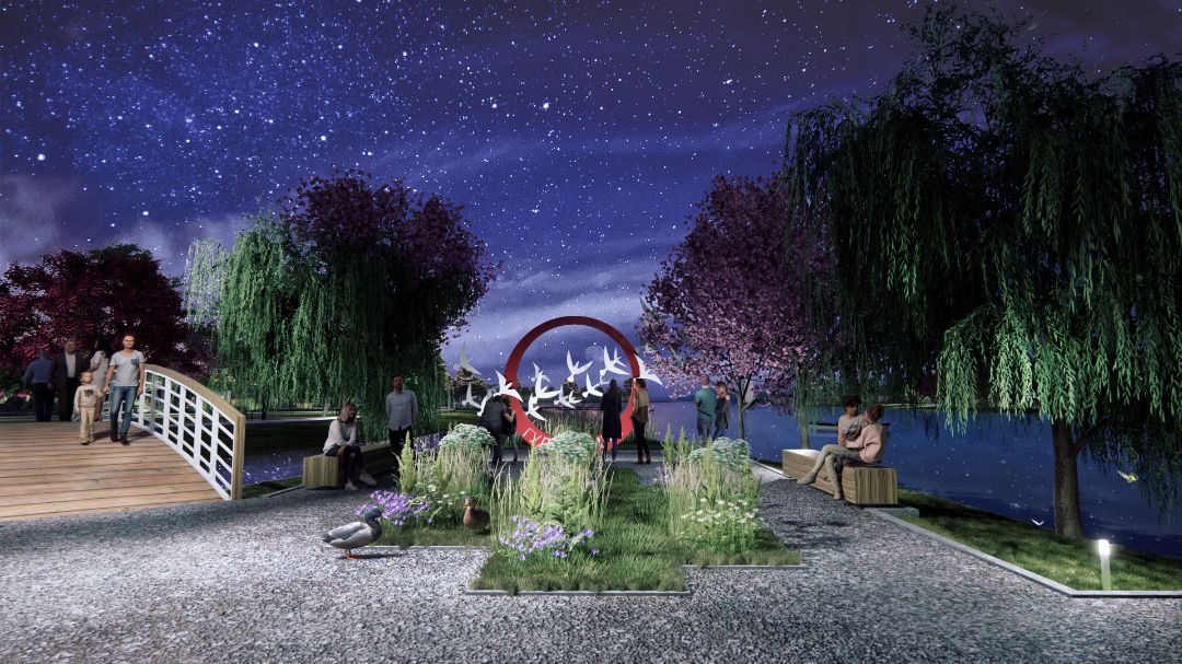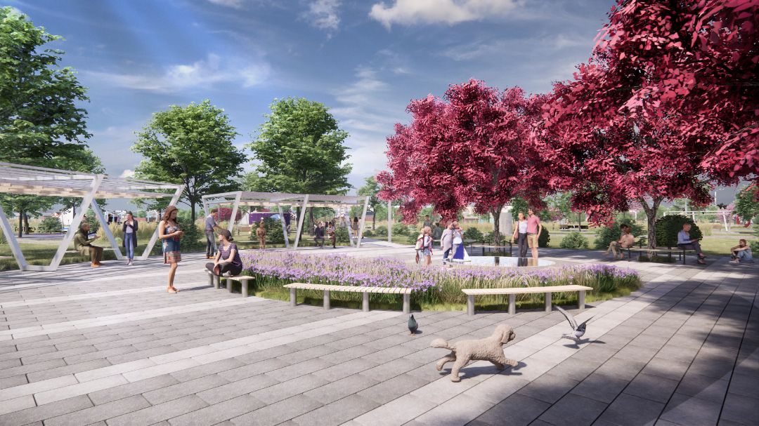 Парк является современным пространством для проведения различных мероприятий и активного отдыха горожан. В пространстве площади можно покачаться на качелях или посидеть за небольшим кофейным столиком, спрятаться под красными кленами на круглых скамейках. На западной стороне площади есть приподнятая сцена, перед которой находится танцпол и сиденья под гирляндами. Дорожки организованы в виде ландшафтных маршрутов для прогулок по парку, а лучевые аллеи обеспечат динамизм, скорость и доступ на кратчайшие расстояния.