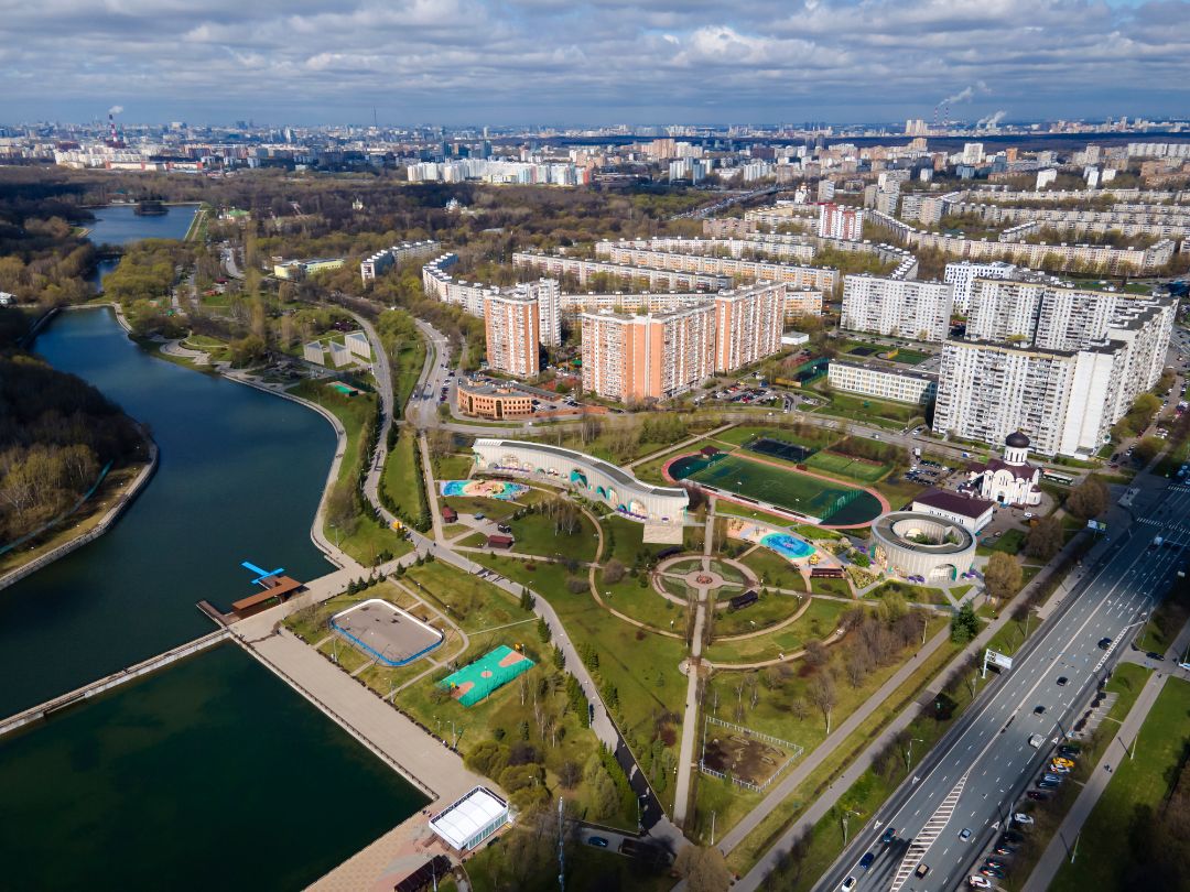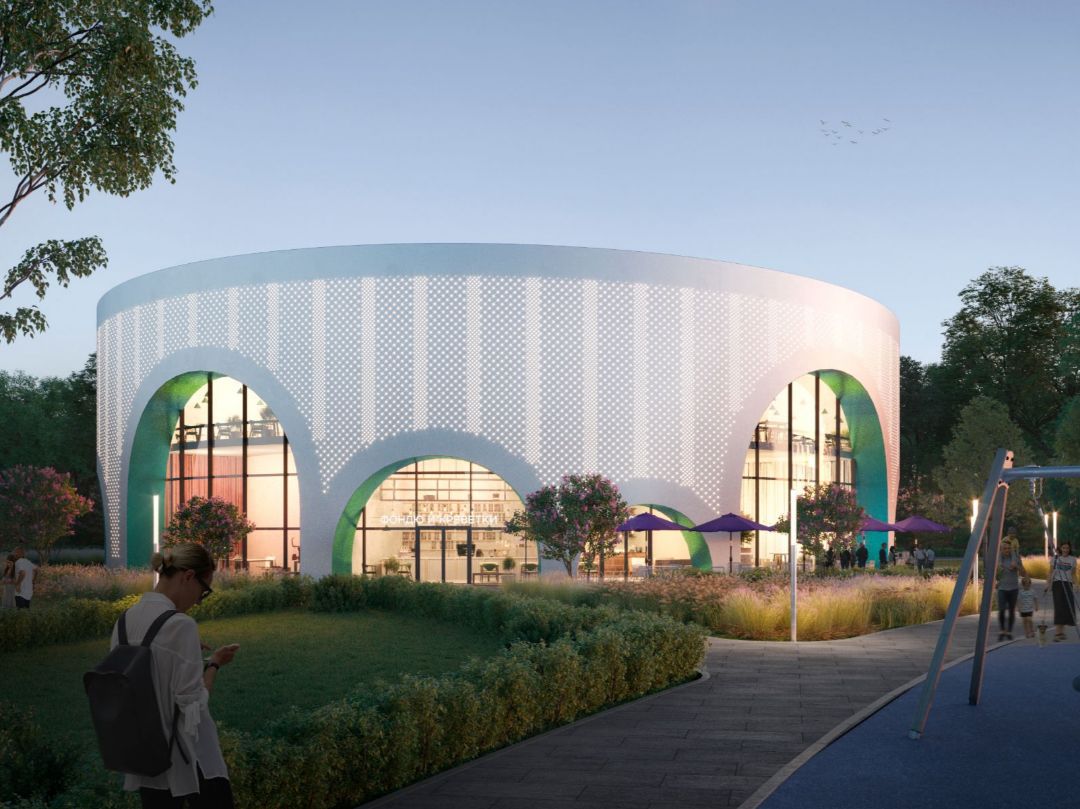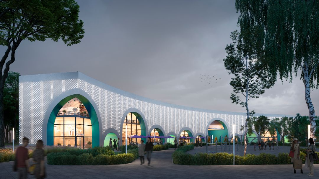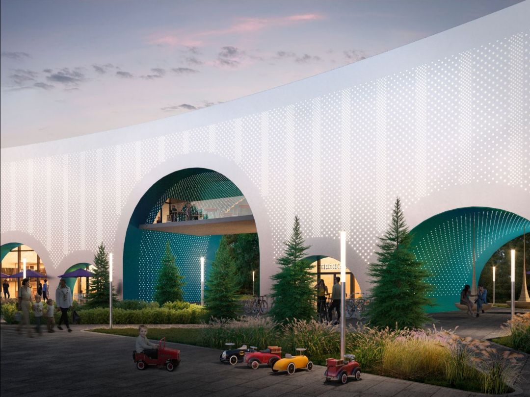 Концепция архитектурных решений основана на стремлении совместить название парка с внешним видом объектов. Арочные проемы и использование хамелеоновой расцветки фасадных панелей отсылают к радуге. Основная цветовая гамма - спокойные, перламутровые световые панели. А в качестве акцента, скрытого в толще арочных проемов, используется яркий цвет морской волны, меняющий свои оттенки на желто-зеленые. Металлические панели перфорированы с разной плотностью, в результате плоскости предметов выглядят неоднородно.