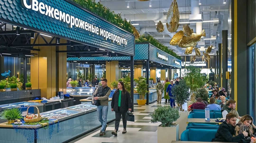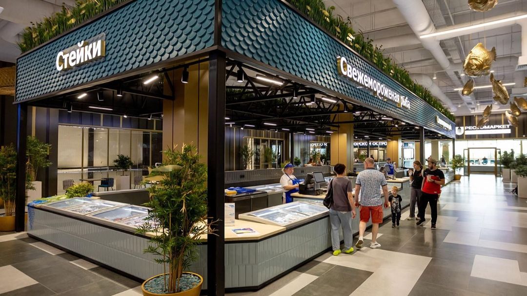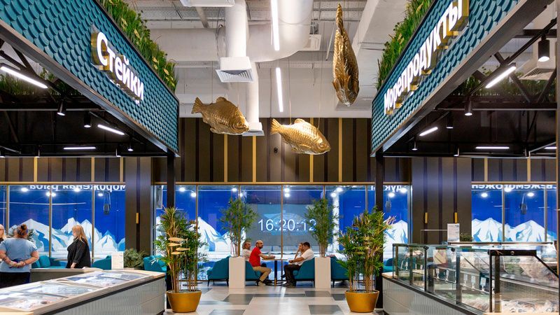 Создание торгового пространства с акцентом на рыбную продукцию. Все пространство должно быть функциональным и удобным как для посетителей, так и для персонала. Дизайн соответствует общей морской тематике. Интерьер хорошо освещен, преимущественно естественным светом. Такой подход позволяет создать атмосферу легкости и свежести, что важно для рынка.