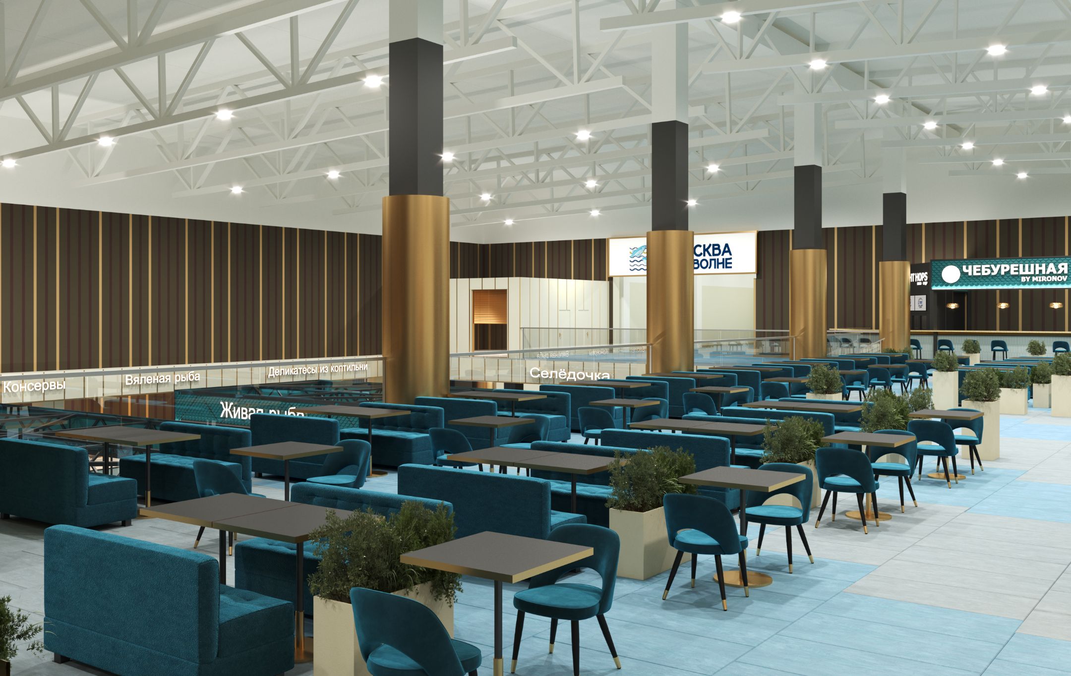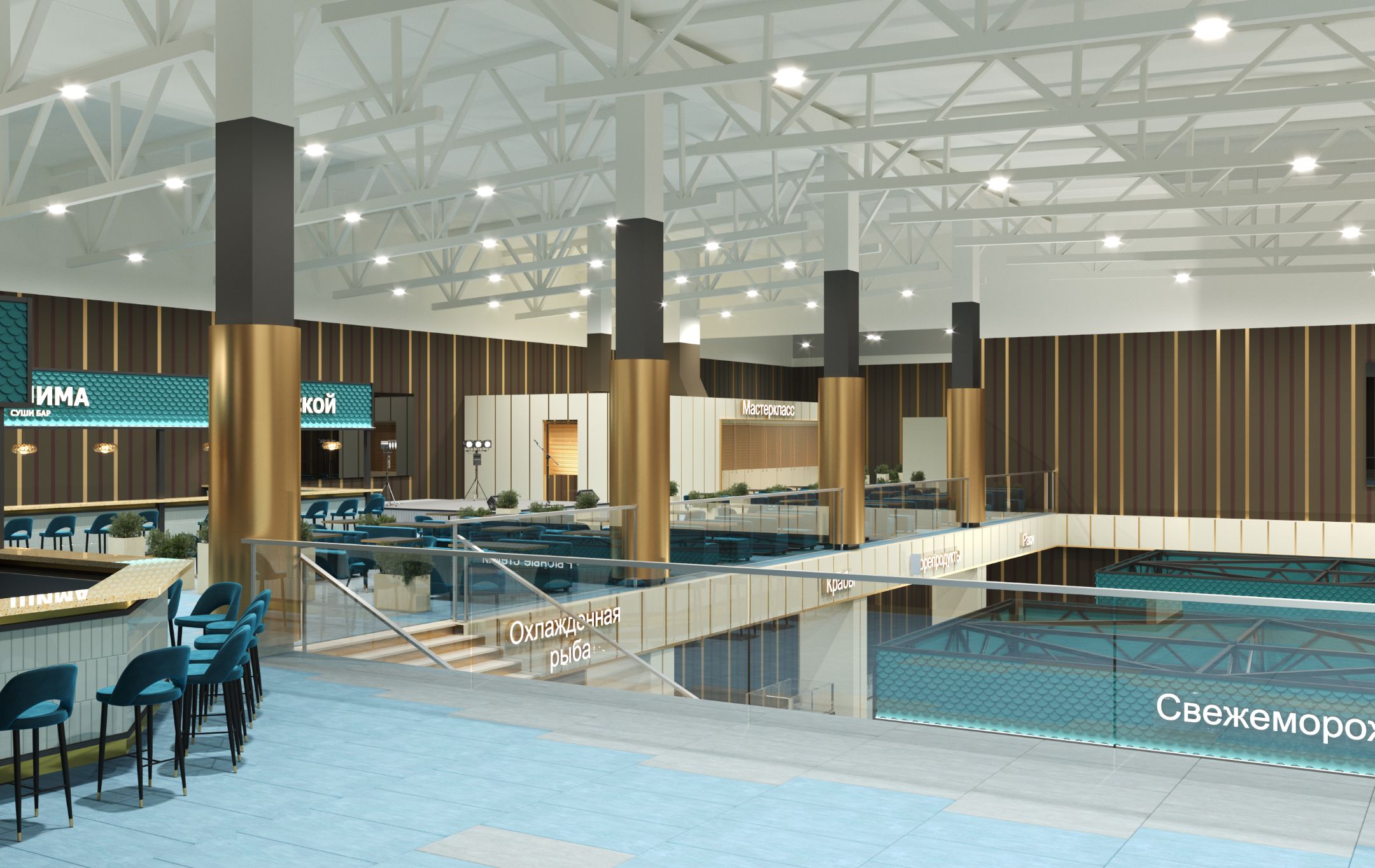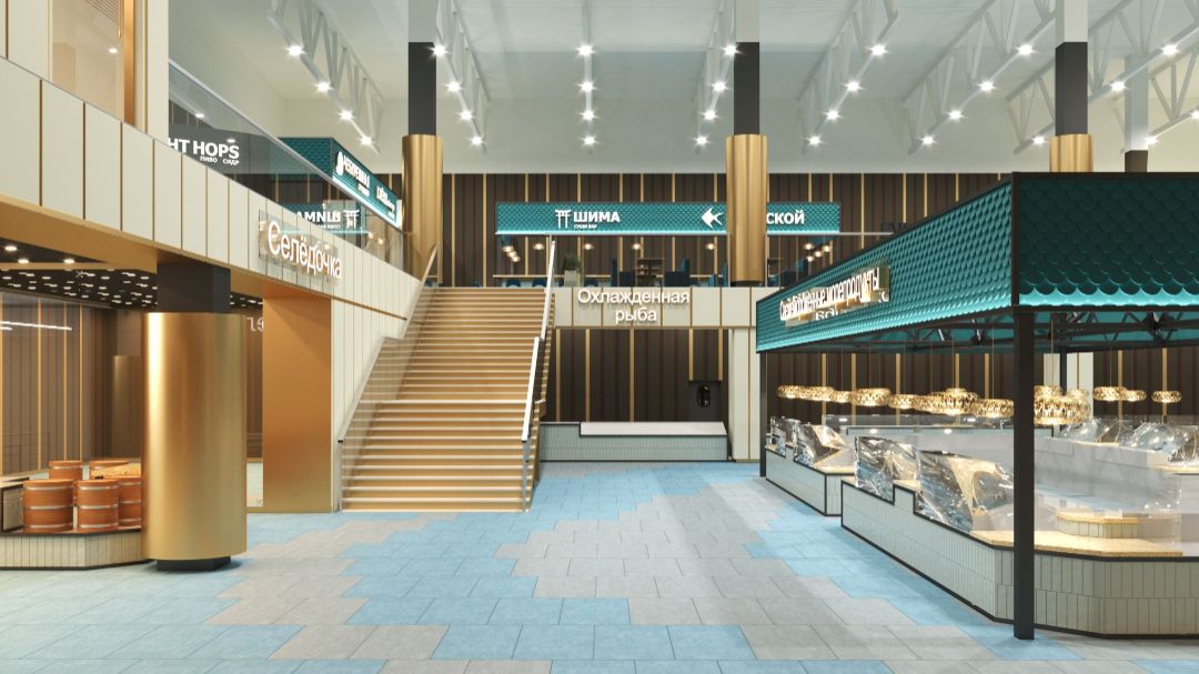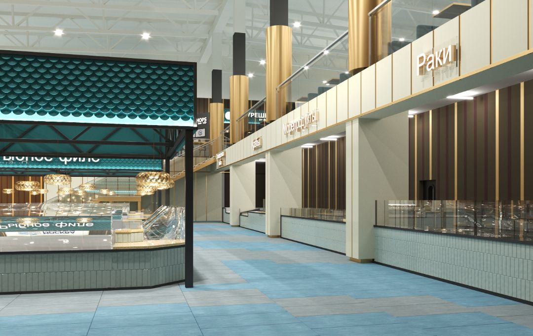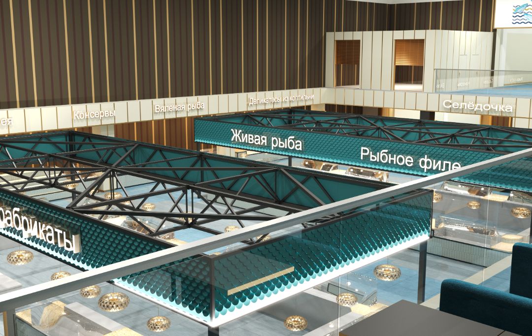 Разработка проекта рынка предполагает создание эргономичного пространства, где главным акцентом выступает ассортимент рыбной продукции. Оформление выдержано в морской стилистике, что отражается во всех деталях интерьера — от декоративных элементов до общей цветовой гаммы. Пространственное решение продумано с точки зрения комфорта: каждый элемент планировки оптимизирован для удобства как покупателей, так и работников.
